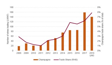Zatímco v roce 2011 představovaly obchody na světových trzích s tímto artiklem pouhé 1%, v současné době je to již 8% a růst podílu se očekává. Vína z Champagne, zejména pak velké obchodní značky jsou součástí tzv. Investičních vín.