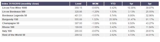 První příčku stále drží Bordeaux, přesto, že 2018 zaznamenal mírný pokles, druhá příča patří Burgundsku, které zaznamenalo 3% nárůst ve srovnání s rokem 2017 a Champagne vytlačila ze třetí příčky velká vína Itálie.