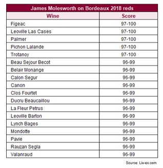 V březnovém čísle Wine Spectator James Molesworth zveřejnil svoje první dojmy a hodnocení velkých vín Bordeaux ročníku 2018 v rámci kampaně Enprimeurs. Níže vína, která dosáhnou na 100 bodové maximum a nebo budou těsně pod ním.